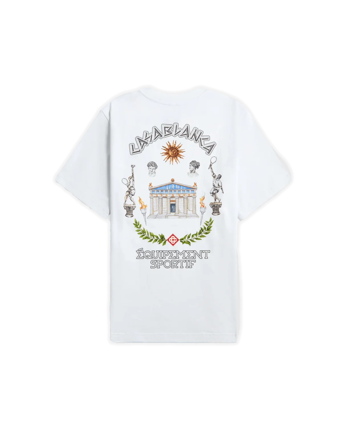 Crafted in Portugal from 100% organic cotton, this Casablanca short‑sleeve tee features seasonal artwork inspired by classical Greek beauty and modern athletic aesthetics. It has a ribbed crew neck, dropped shoulders, and graphic prints on both the front and back, merging cultural motifs with casual comfort.