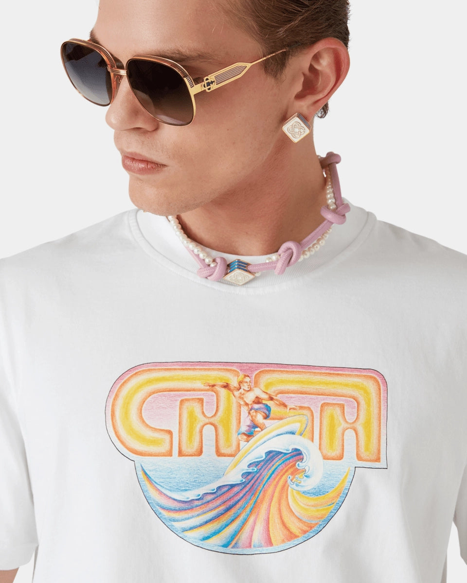 The Casablanca Surf T-Shirt is a short-sleeve printed design crafted from organic cotton fabric and features seasonal artwork inspired by vintage sun-faded surfboards from the 70s. Completed with a classic crew neck.