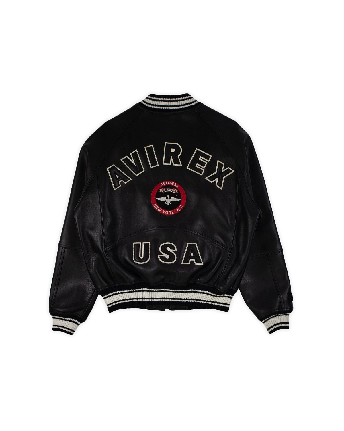 The AVIREX Stadium Jacket in Black is a sleek, modern take on a classic sportswear staple. Crafted with a durable wool-blend body and contrasting leather sleeves, it combines style and functionality. Signature AVIREX branding and embroidered patches add a bold, athletic edge, while ribbed cuffs, collar, and hem provide a comfortable fit. The jacket’s versatile black colorway makes it easy to pair with any outfit, adding a refined, street-ready touch to your wardrobe. Perfect for those who value quality and timeless design.