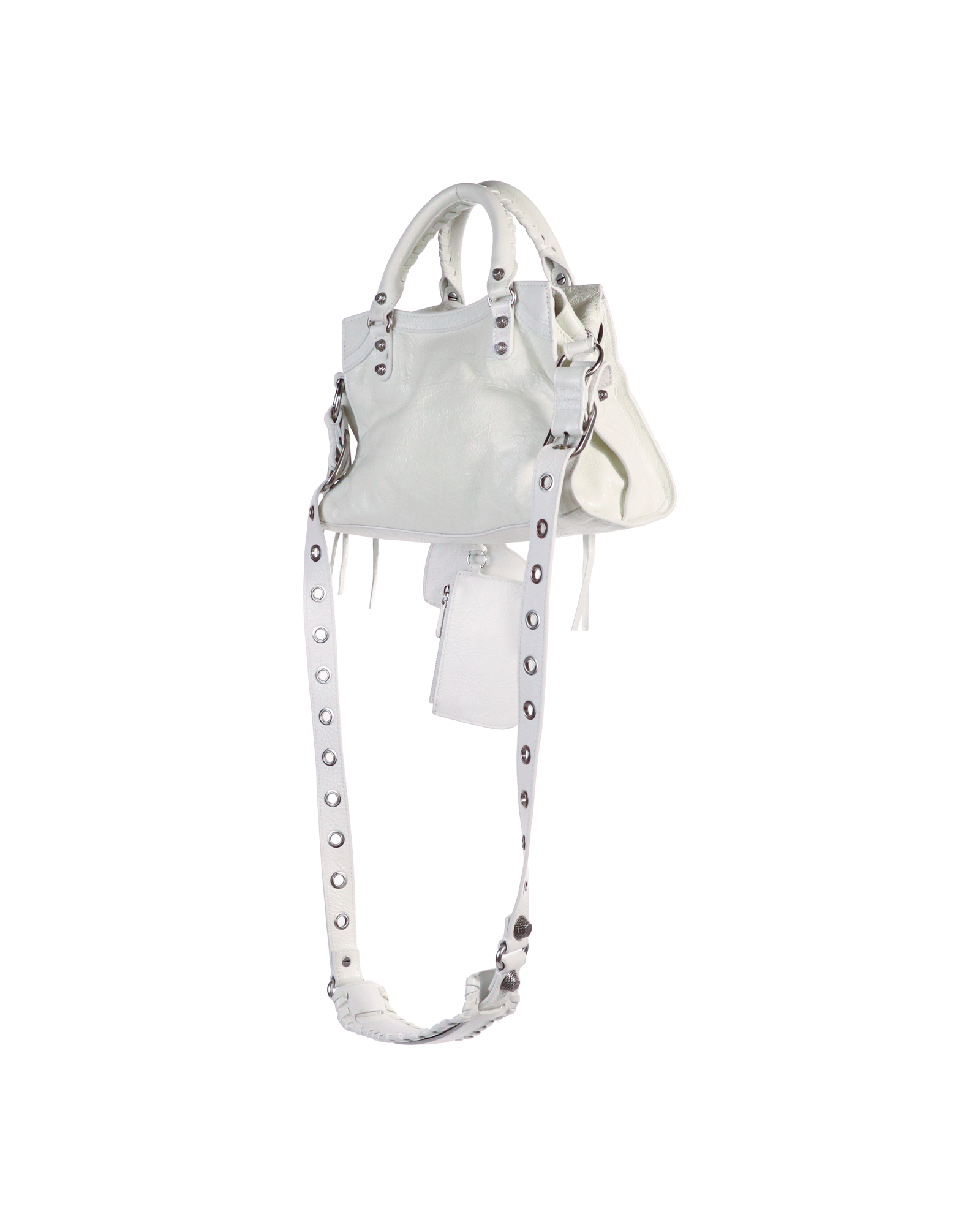 The Balenciaga Small City Bag in white leather with signature motorcycle-inspired hardware and a detachable mirror charm. A compact twist on the cult classic, blending edgy style with everyday practicality.