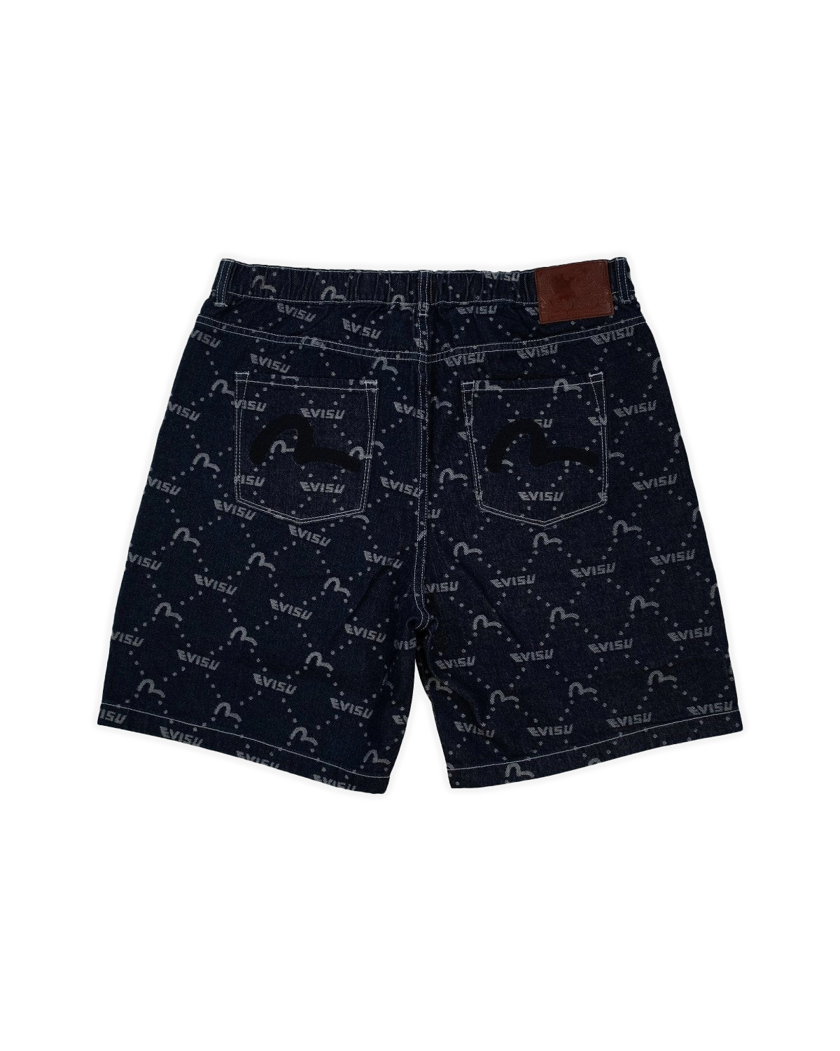 The EVISU Denim Shorts feature a stylish, all-over print with the iconic EVISU seagull logo and branding, giving them a bold, streetwear vibe. These dark denim shorts are crafted from high-quality denim, offering both durability and comfort. The design includes classic five-pocket styling, a button closure, and the signature EVISU seagull motif embroidered in yellow on the right pocket, adding a unique touch. Perfect for those who love combining luxury denim with a casual, urban look, these shorts are ideal for making a statement in any casual setting.