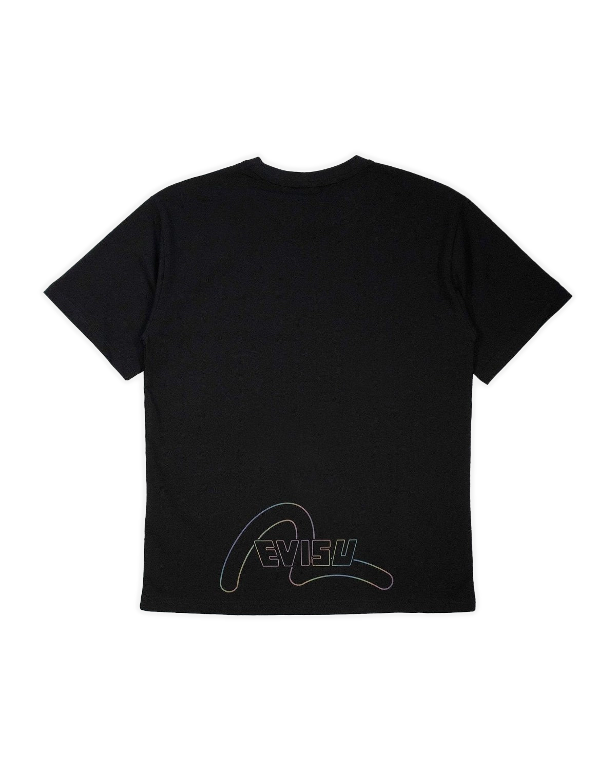 This black Evisu T-shirt features a bold chest print and a small logo on the lower back. The prints are chameleon colored and reflective. Made from premium cotton, it's the perfect blend of comfort and style. Available exclusively at Bloc Magasin.