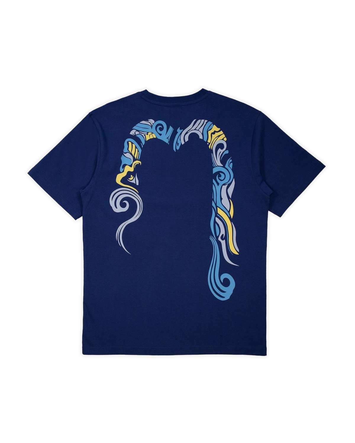 This navy-blue Evisu T-shirt features a small chest print and bold logo on the back. Made from premium cotton, it's the perfect blend of comfort and style. Available exclusively at Bloc Magasin.