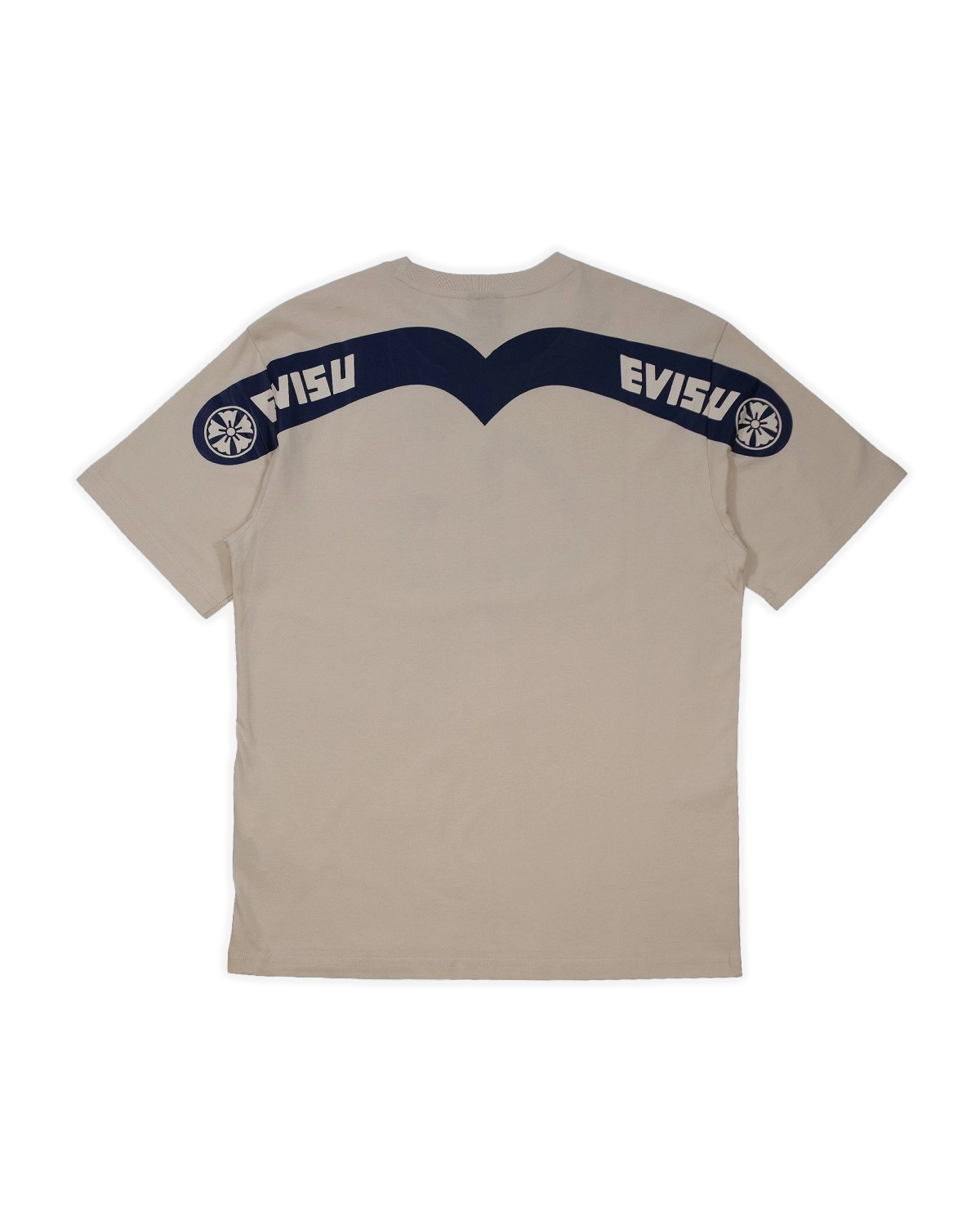 The Evisu Graphic Print T-Shirt in beige combines bold streetwear design with Evisu’s iconic branding. Crafted from 100% premium cotton, this T-shirt ensures both comfort and durability. The back features a large graphic in blue, offering a strong visual contrast against the beige fabric, which highlights the brand’s distinctive style.