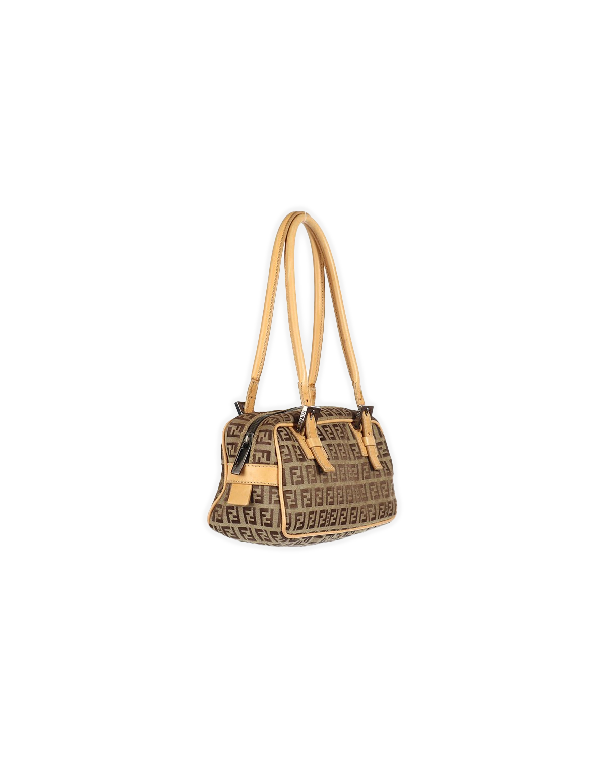 A sleek and structured Fendi Zucchino FF Mini Boston Bag featuring a logo canvas with leather trim and handles with enough space to fit small items. Perfect for events or clubbing!