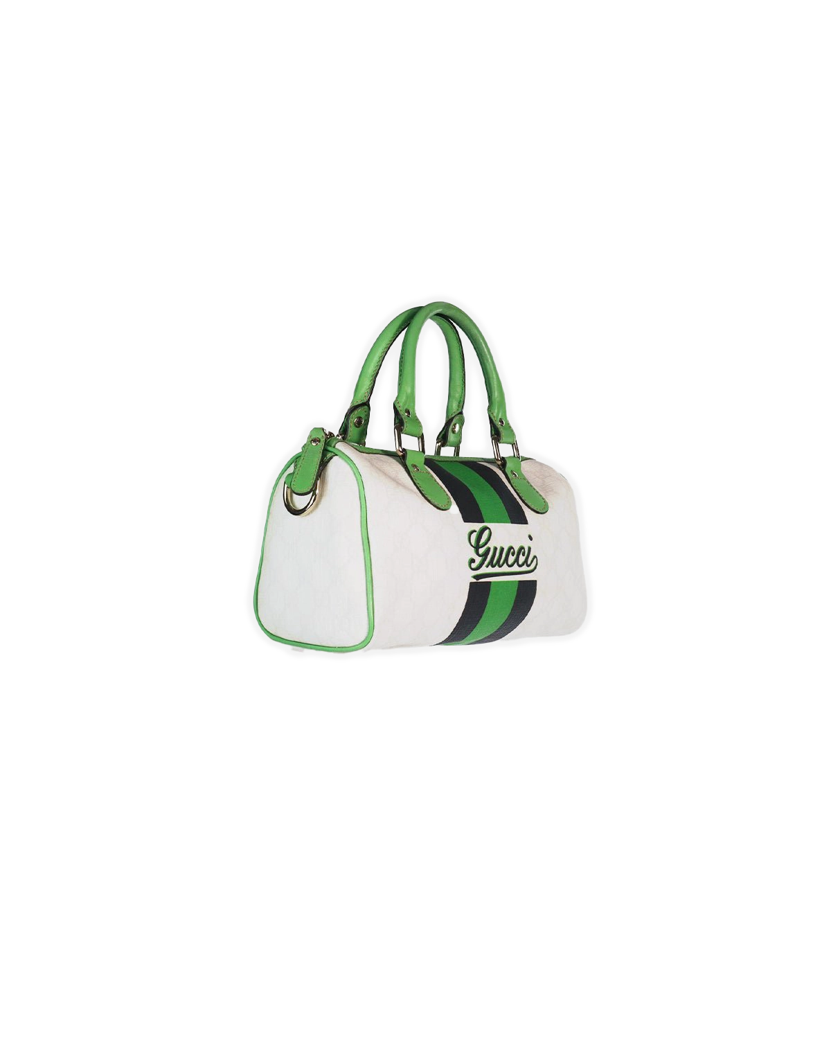 A standout Gucci Joy Boston Bag in signature GG Supreme coated canvas (beige monogram) with smooth white leather trim and rare green detailing. Classic Boston silhouette with zip closure—bright, clean, and eye-catching without trying too hard.