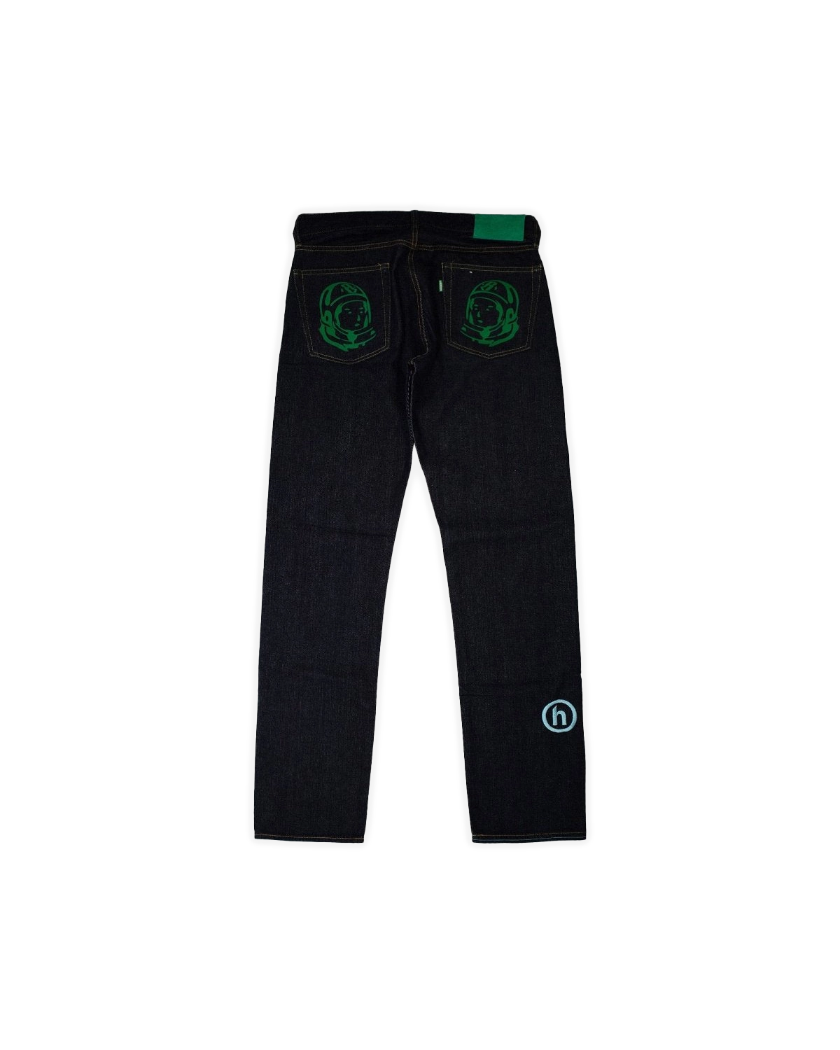 The Hidden NY x BBC Running Dog Jeans are a stylish blend of streetwear aesthetics and unique design. Crafted from high-quality denim, these jeans feature an eye-catching green gem embellishment on the iconic Running Dog graphic, making them a standout piece in any wardrobe.
