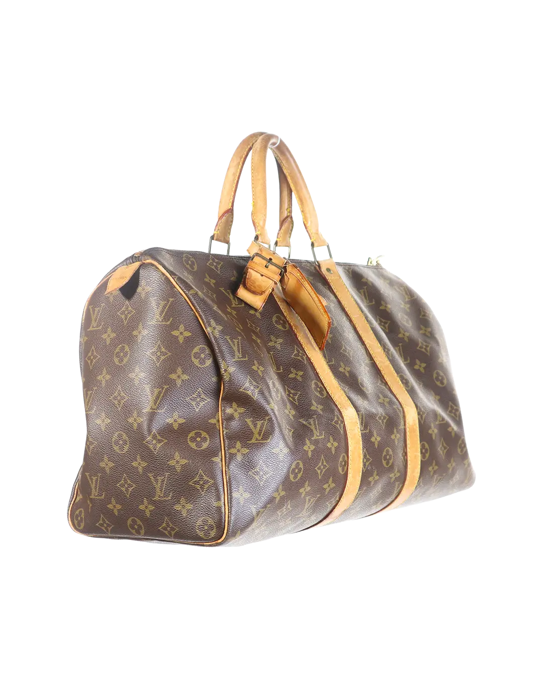 This vintage Louis Vuitton Keepall 45 shows gentle signs of wear consistent with age, including light creasing to the canvas and a natural patina on the vachetta leather. Minor surface marks may be present. Please review the photos for full details.