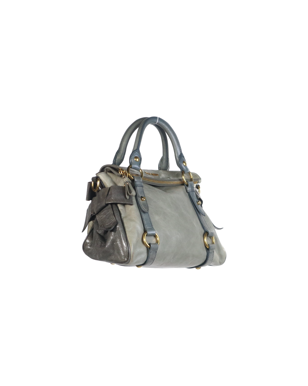 A refined Miu Miu Vintage Leather Satchel crafted in a smoky grey lambskin with contrasting slate leather straps. The structured-yet-soft silhouette features Miu Miu’s signature ring details, oversized front buckles, and a curved top zip that adds a modern utilitarian edge.