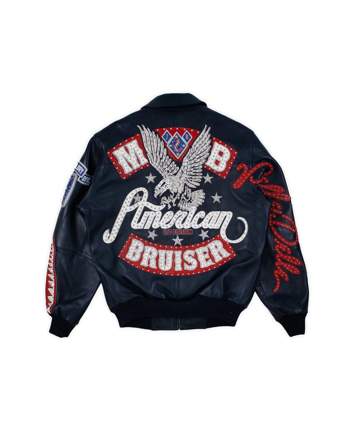 The navy-blue PELLE PELLE American Bruiser Leather Jacket is a bold statement piece, crafted from premium leather with a standout vintage-inspired design. This jacket features signature Pelle Pelle embroidery, intricate detailing, and a comfortable, structured fit. Designed to capture the spirit of classic American streetwear, it’s perfect for those looking to add iconic style to their wardrobe.
