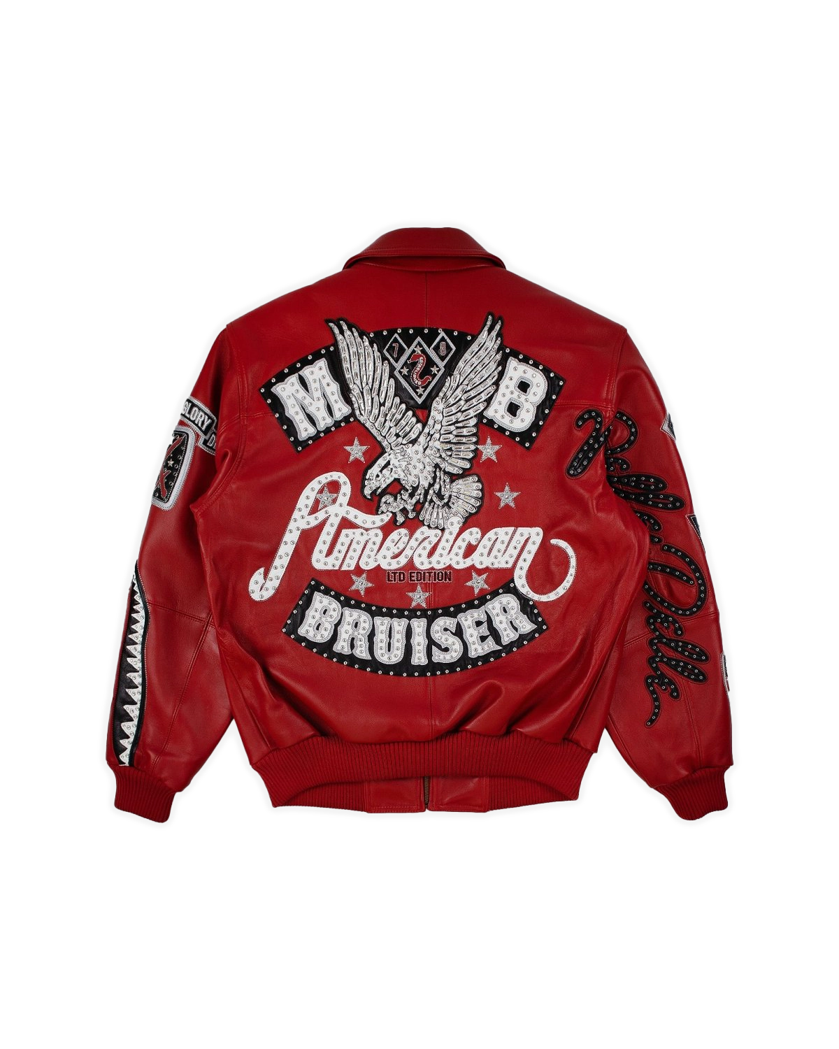 The red PELLE PELLE American Bruiser Leather Jacket is a bold statement piece, crafted from premium leather with a standout vintage-inspired design. This jacket features signature Pelle Pelle embroidery, intricate detailing, and a comfortable, structured fit. Designed to capture the spirit of classic American streetwear, it’s perfect for those looking to add iconic style to their wardrobe.